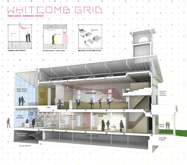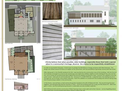 The idea for the 2013 competition was based on a real-life scenario, a building located in the Village of West Swanzey, NH, named Whitcomb Hall. The building has a prominent location in the village and has historically provided a strong role as a gathering place in the community. It has been vacant since 1988. At a recent Plan NH Charrette, the planning team recommended that the Whitcomb Hall building become a premier, for-profit event facility that serves the southwest region of the State. The facility should be capable of hosting events from 10-250 people with a plan that allows for flexible use and multiple configurations of the space.