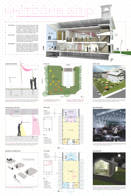 This is the “Swiss army knife” of the competition with a lot of practical details that enhanced the user experience while preserving the overall character of Whitcomb Hall. The idea of the grid was a good defining concept, which not only brought order to the interior spaces, but also provided a good alternative to accessorizing the outdoor lawn to the west. This provided for a number of additional outdoor events to enhance the use of Whitcomb Hall to include: farmers markets, movie nights, concerts, and other various public gatherings.